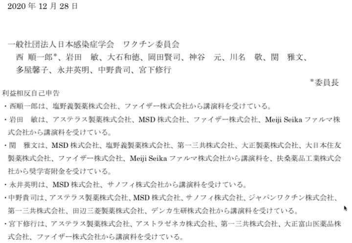 一般社団法人日本感染症学会 ワクチン委員会 COVID-19 ワクチンに関する提言 (第1版) :昨年の12月末に「日本感染症学会 ワクチン委員会 」から『COVID-19 ワクチンに関する提言 』が発表され、ワクチンの接種が推奨されています。しかしながら、このワクチン委員会のメンバーの多くが、ファイザーやMSDなどの新型コロナワクチンの製造メーカーから謝礼を受け取っています。